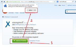 Setelah itu Anda akan muncul halaman situs resmi add-ons mozilla pada halaman AnonymoX, silahkan langsung klik “add to firefox” dan langsung pilih allow dekat tombol menu Bar seperti gambar di bawah ini. (klik untuk memperbesar gambar)