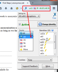 Lalu kita beralih ke cara menggunakan AnonymouX, caranya Klik Tanda X pada menu bar pojok kanan atas, Lalu pilih negara yang Anda inginkan dan Klik Centang Active. (klik untuk memperbesar gambar)